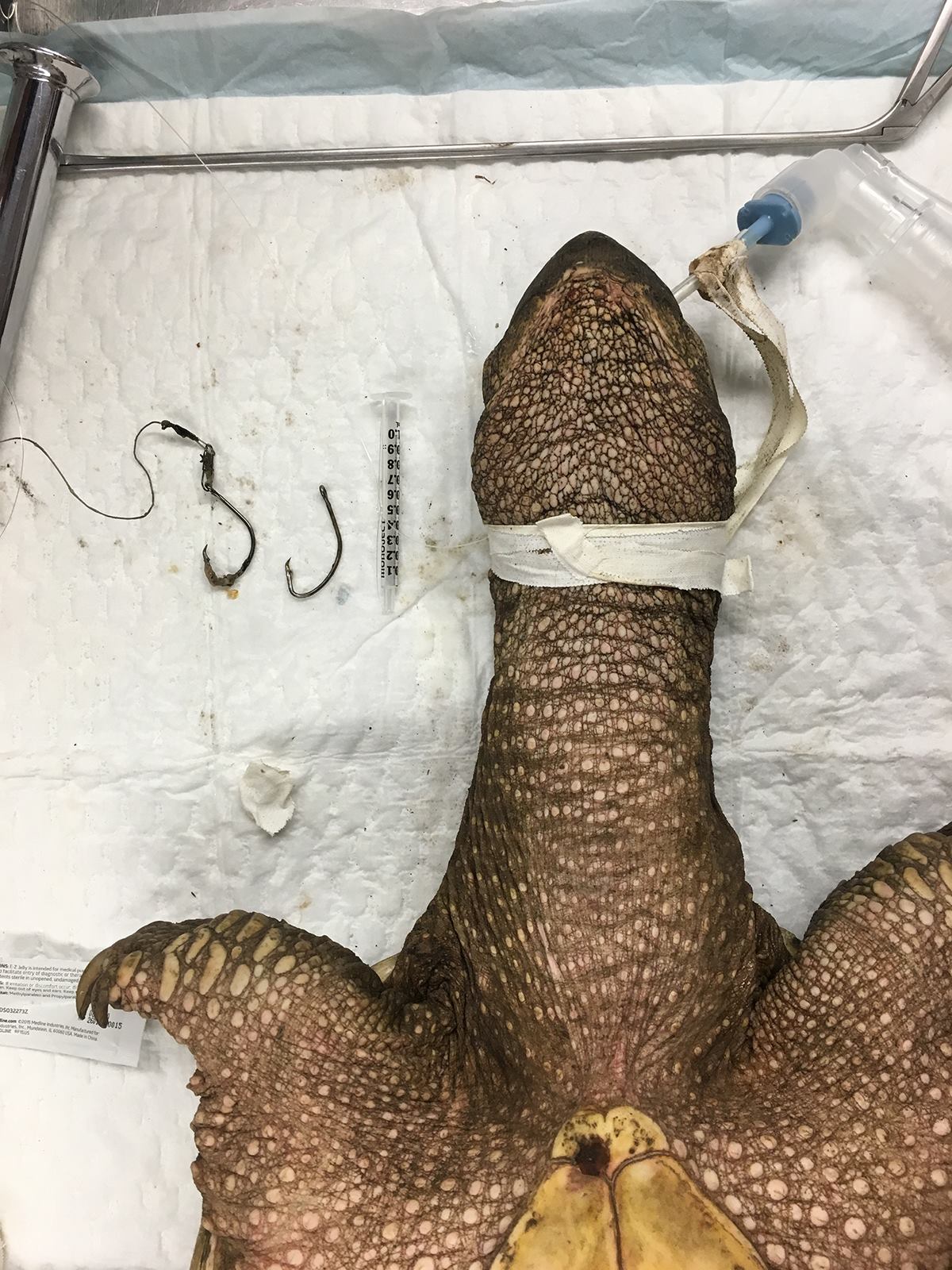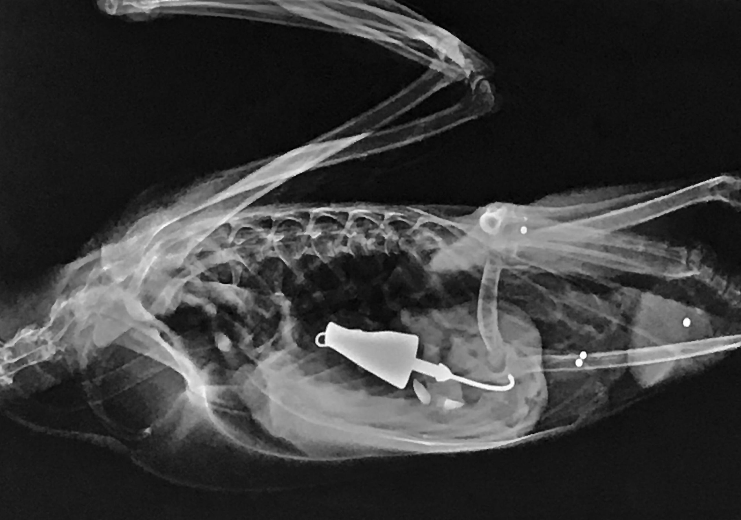 This snapping turtle originally presented to the clinic because a Good Samaritan had seen the fishing line and assumed there was a hook attached. On radiographs, we were surprised to find two hooks, one within the esophagus (and attached to the fishing line) and one within the stomach.